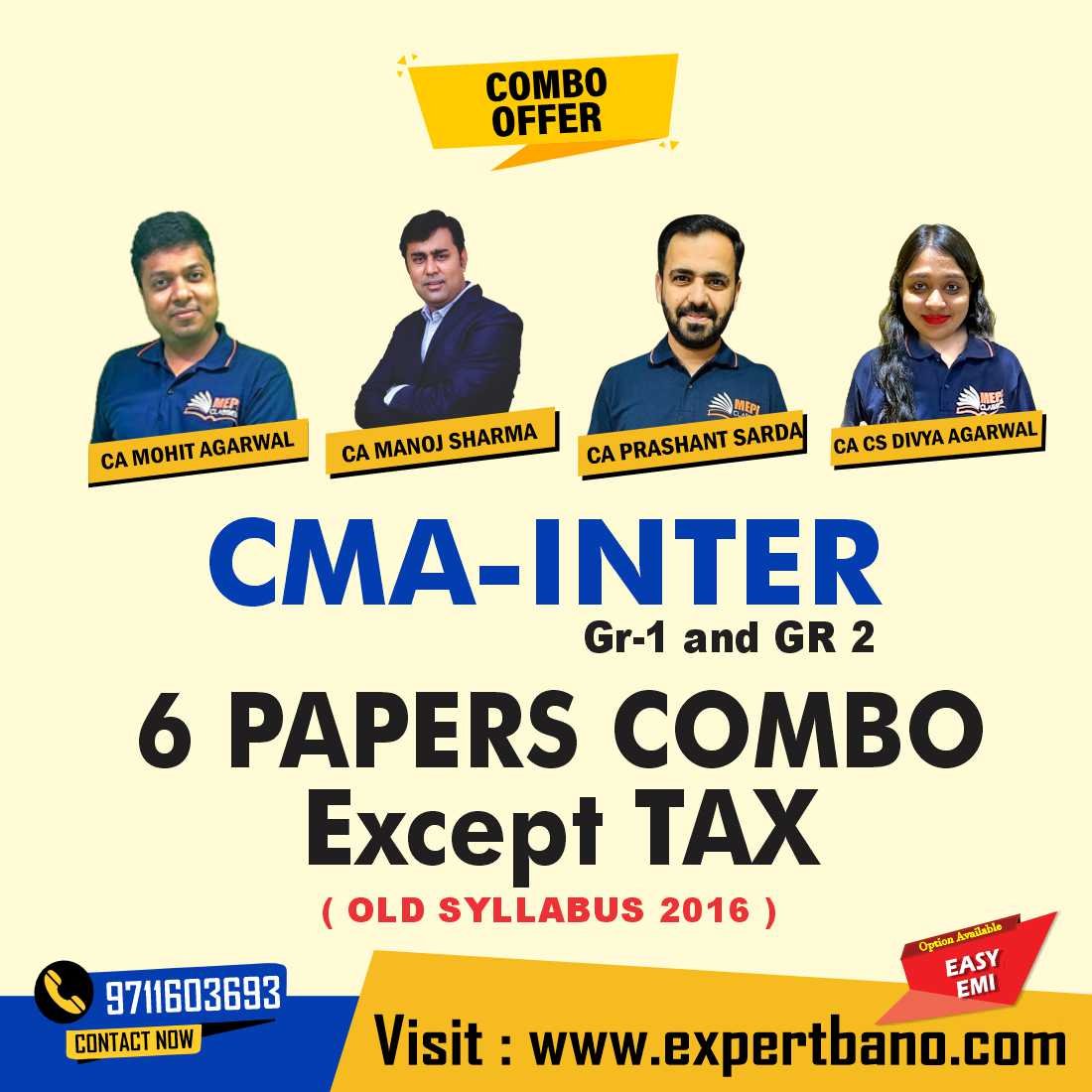 Latest video Lectures of CMA Inter Gr-1 and GR 2 – 6 PAPERS COMBO Except TAX by MEPL Classes CA Mohit Agarwal along with the study material.